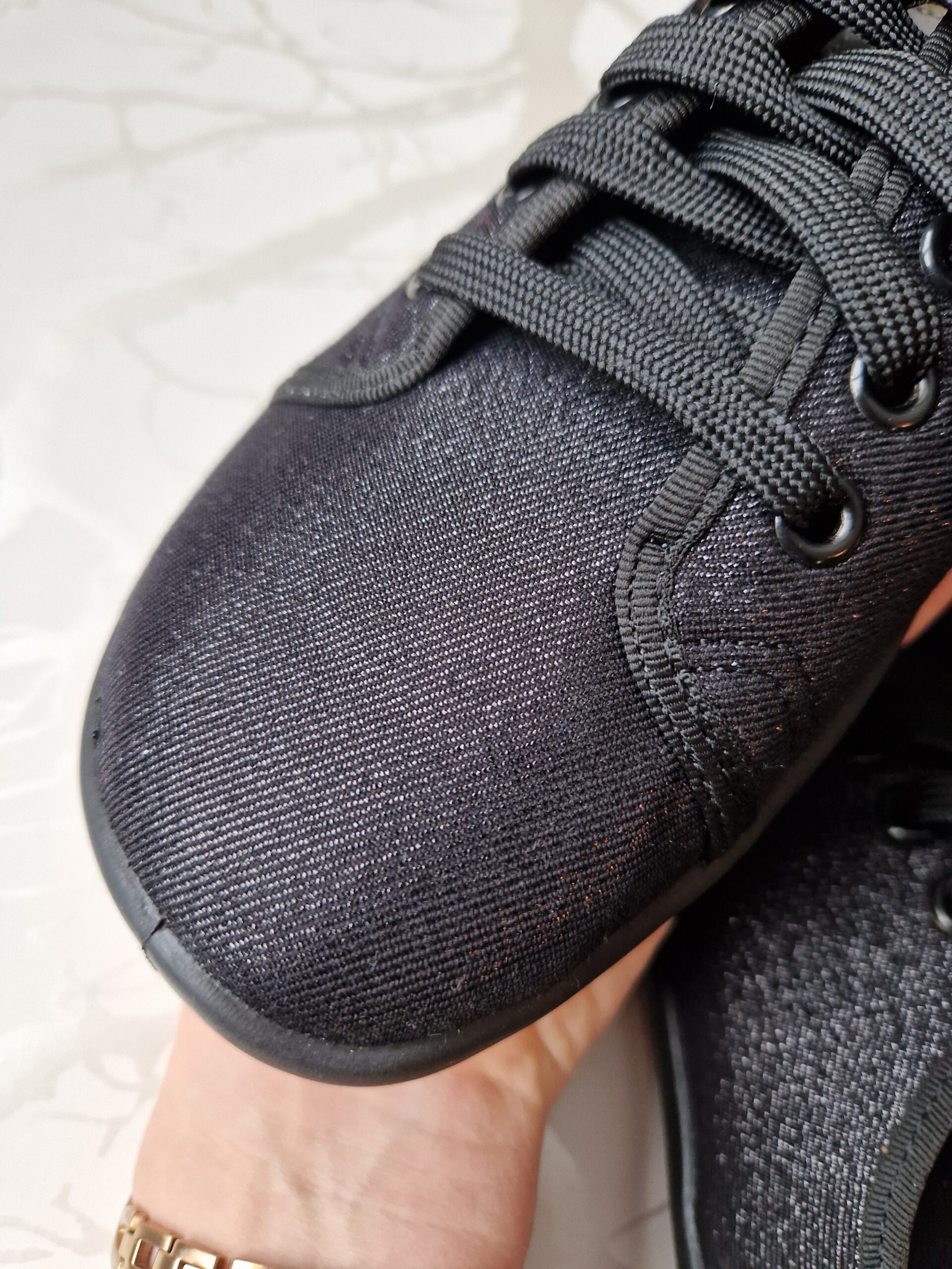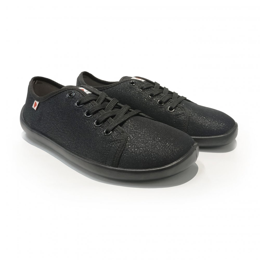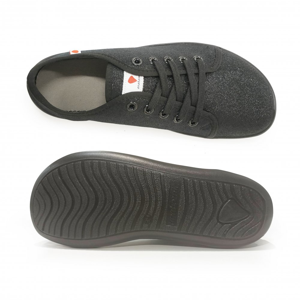 Anatomic barefoot tekstiilist tennised. Tennised on kaetud sädeleva riidega, millele ei ole sädelust peale lisatud, ehk see ei ole pudenev. Tennistel on avar ninaosa, mis ei suru varbaid ebaloomulikult kokku. Visuaalselt võivad tenniste tallad tunduda paksud, kuid tegelikkuses ulatub talla liist tenniste riidest osa peale ning tennistel on vaid 5 mm paksune termoplastist kummitald, mis tagab hea kontakti maapinnaga. Tennistel on hingav 2-kihiline puuvillane riie ning eemaldatav sisetald. Kuna sisetald on hästi õhukene ja pehme, võivad need jalanõude äravõtmisel nihkuda. Selleks soovitame talla ja tenniste vahele panna õhuke kahepoolne teip, mis võib nihkumise vastu aidata. Jalanõud sobivad kandmiseks nii õues vabal ajal, pikkadel jalutuskäikudel, kui ka on ideaalsed vahetusjalanõud tööle või kooli.