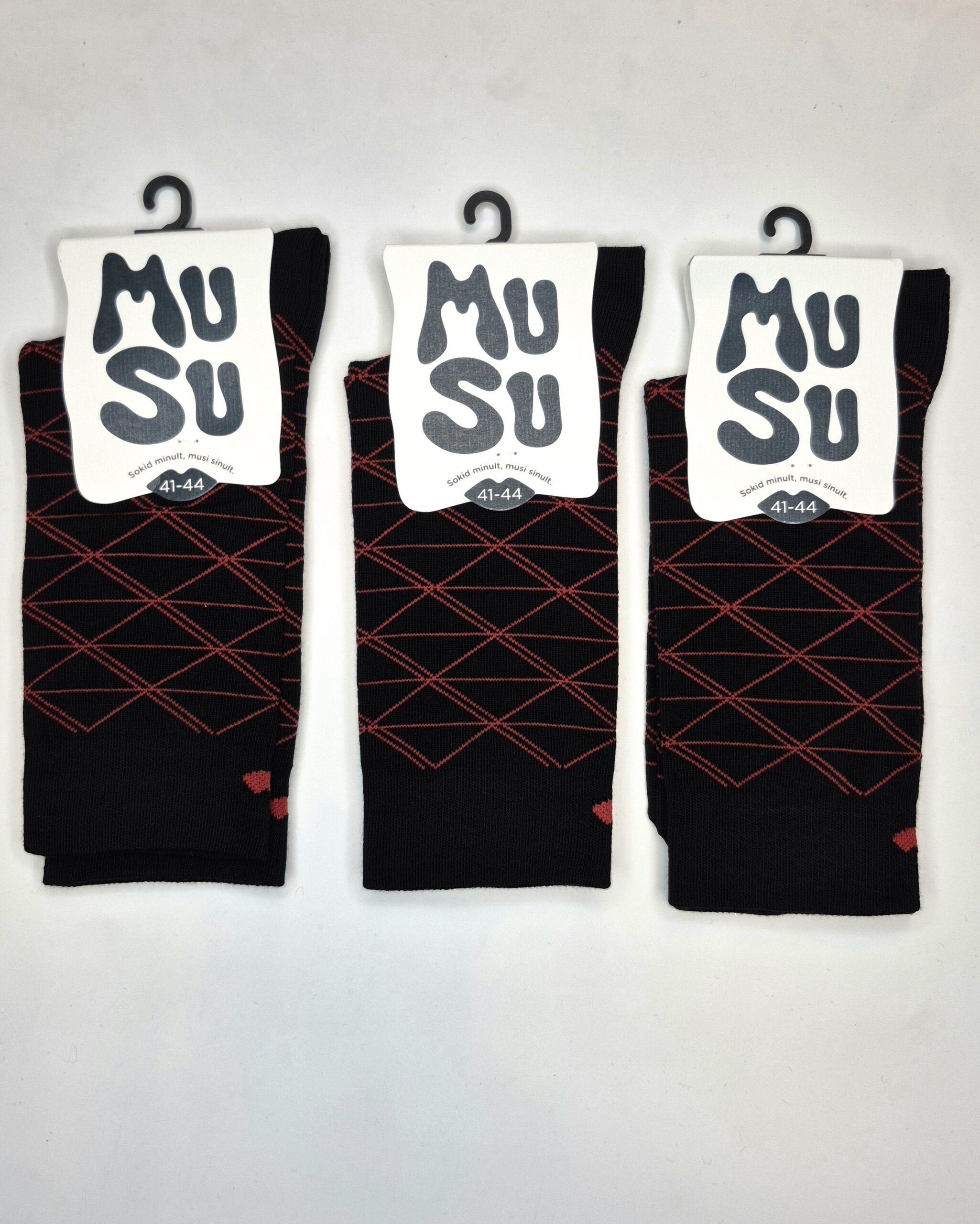 MuSu mustad sokid punaste rombi kujuliste triipudega on suurepärane valik mehele, kes soovib vältida traditsioonilisi jõuluteemalisi rõivaid, kuid tahab siiski oma riietusse lisada pisut jõuluhõngu.