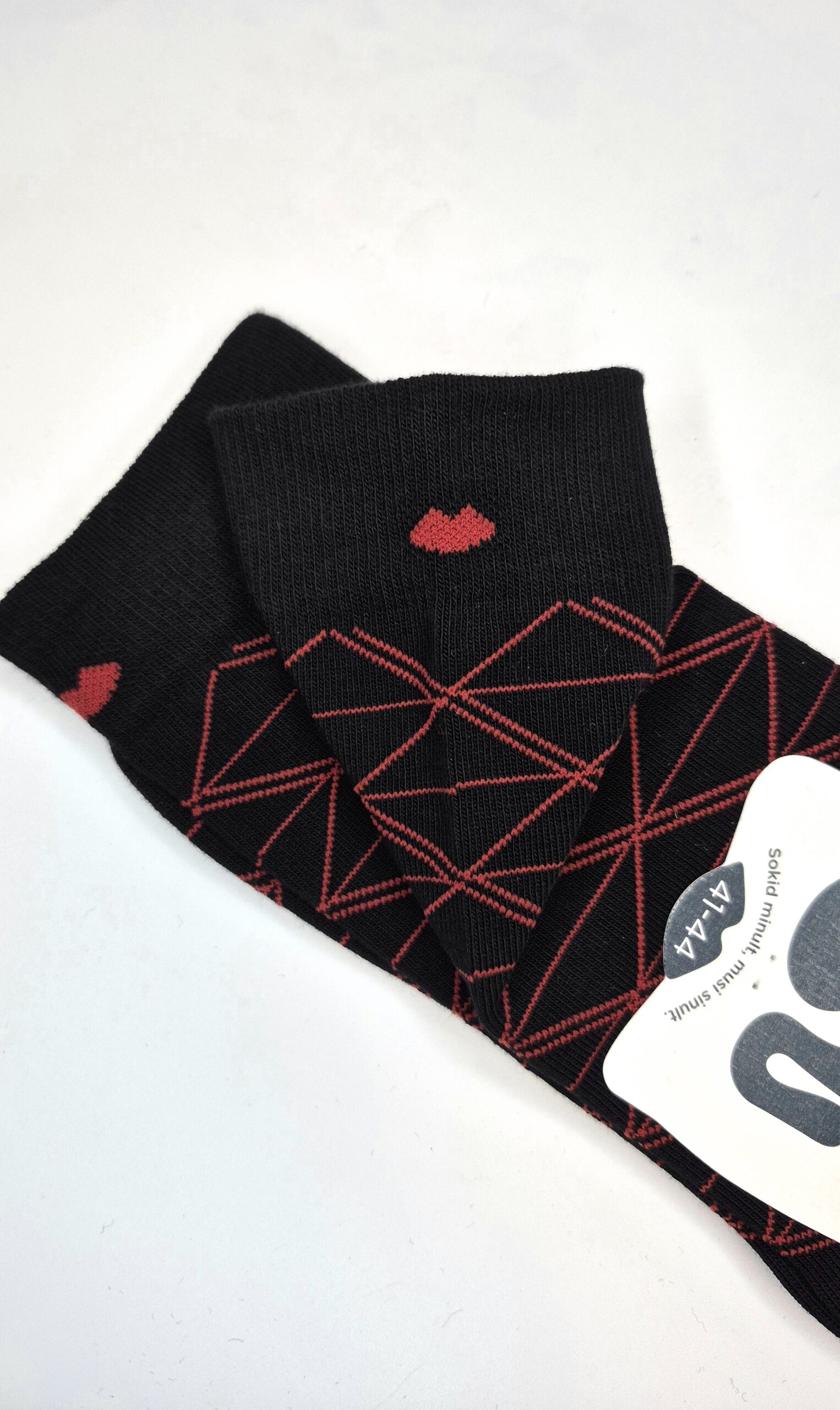 MuSu mustad sokid punaste rombi kujuliste triipudega on suurepärane valik mehele, kes soovib vältida traditsioonilisi jõuluteemalisi rõivaid, kuid tahab siiski oma riietusse lisada pisut jõuluhõngu.