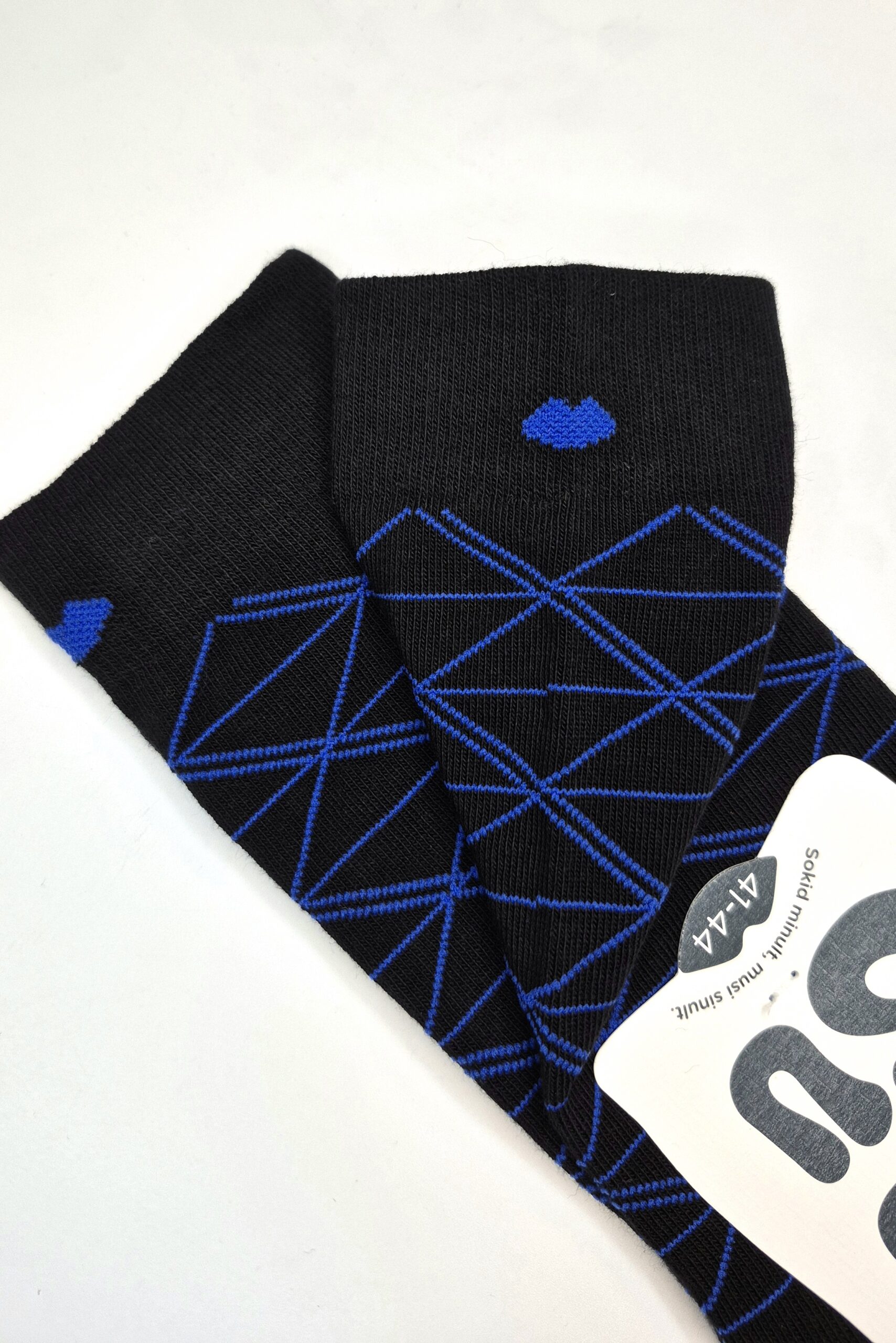 MuSu mustad sokid siniste rombi kujuliste triipudega on ideaalne valik mehele, kes soovib oma igapäevaellu värvi ja särtsu lisada!